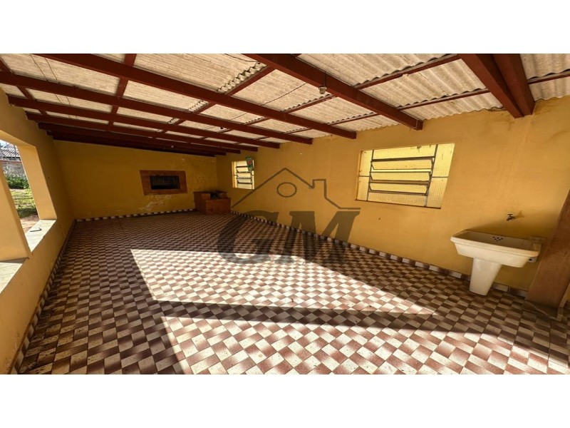 Sala, cozinha, 2 quartos, banheiro, garagem coberta, área de churrasqueira, terreno amplo.